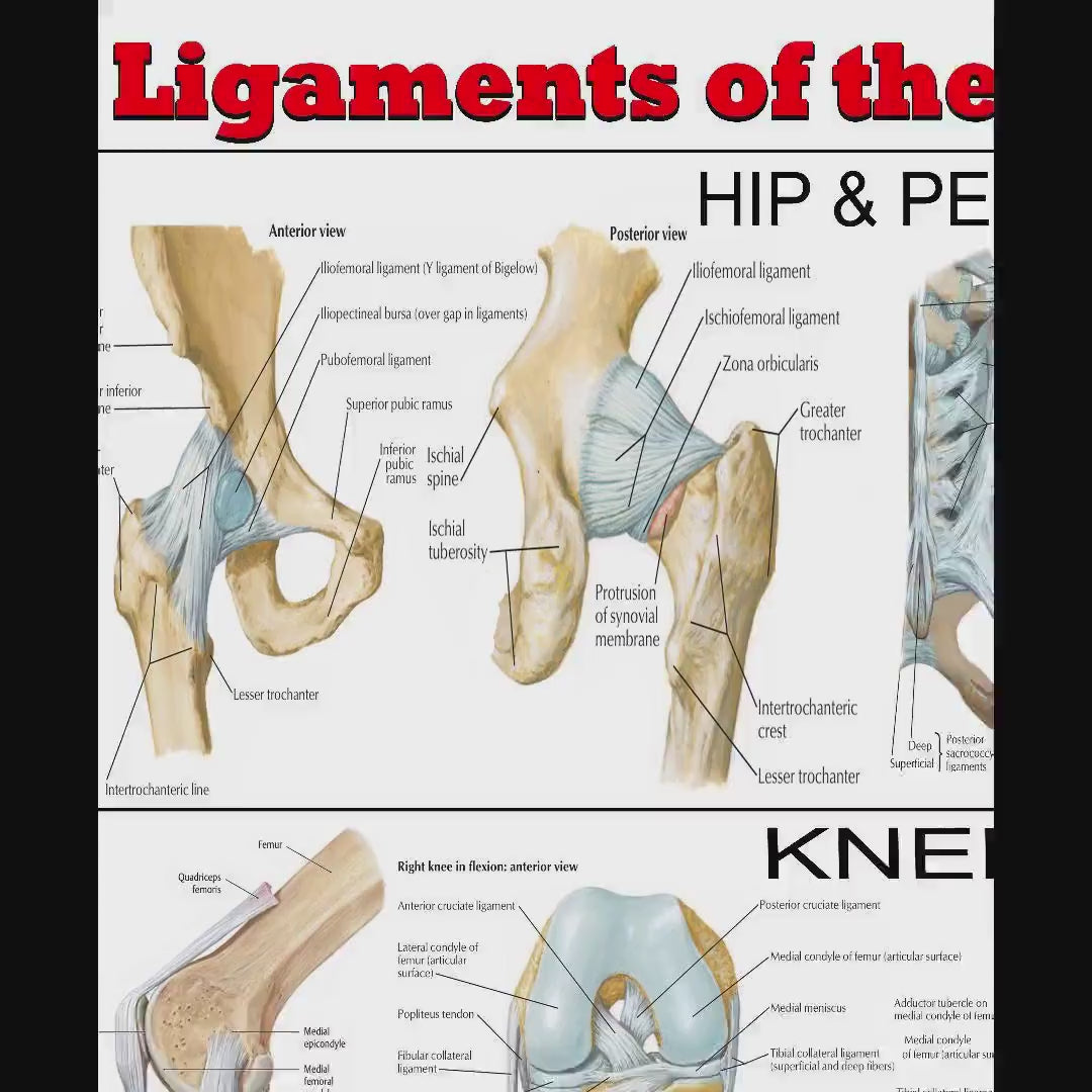 - Detailed illustrations of key ligaments in the knees, hips, and ankles, with clear labeling and descriptions.